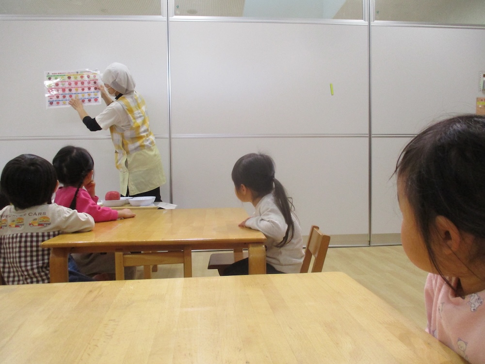 りんごの旬や色んな品種があること、りんごがどのようにして育つのかなどを写真も使いながら教えてもらうと、みんな真剣に聞いていました。実際にりんごの皮を剥く様子を見る際も興味津々で見つめていたこどもたちでした。